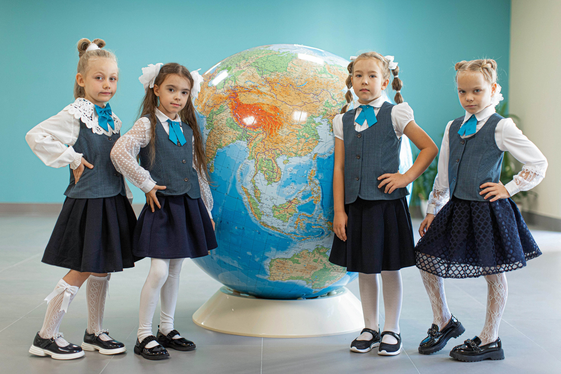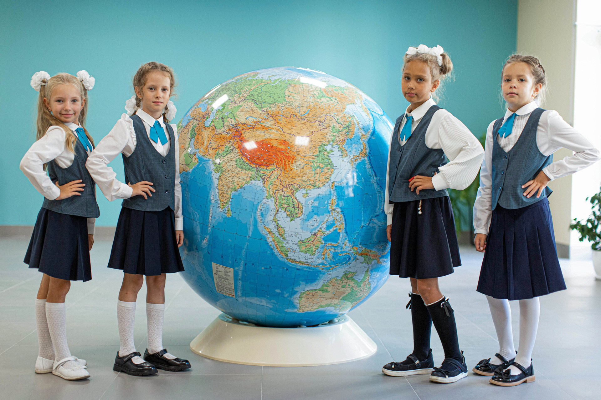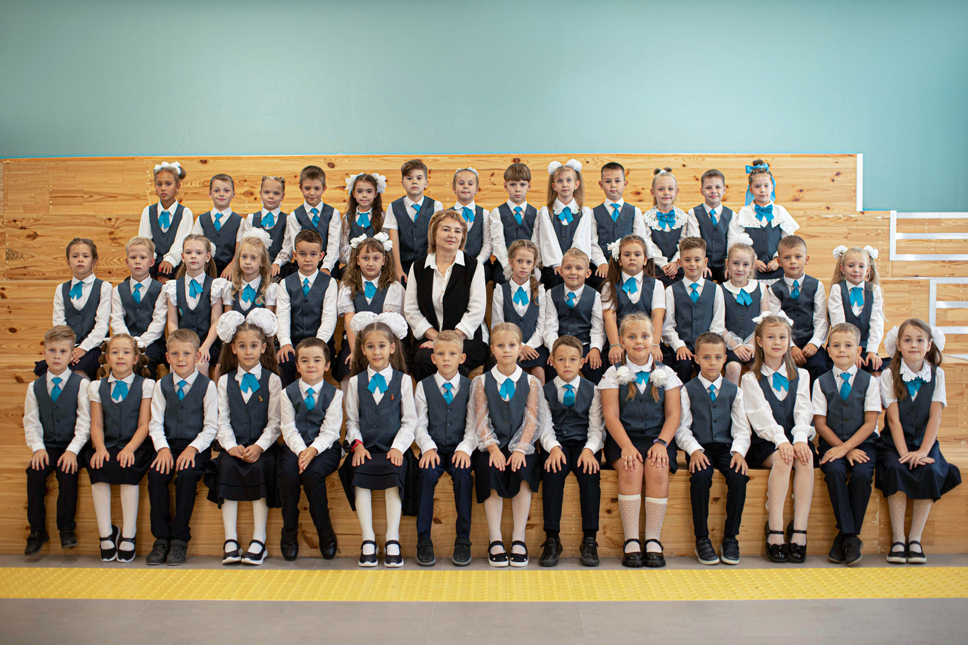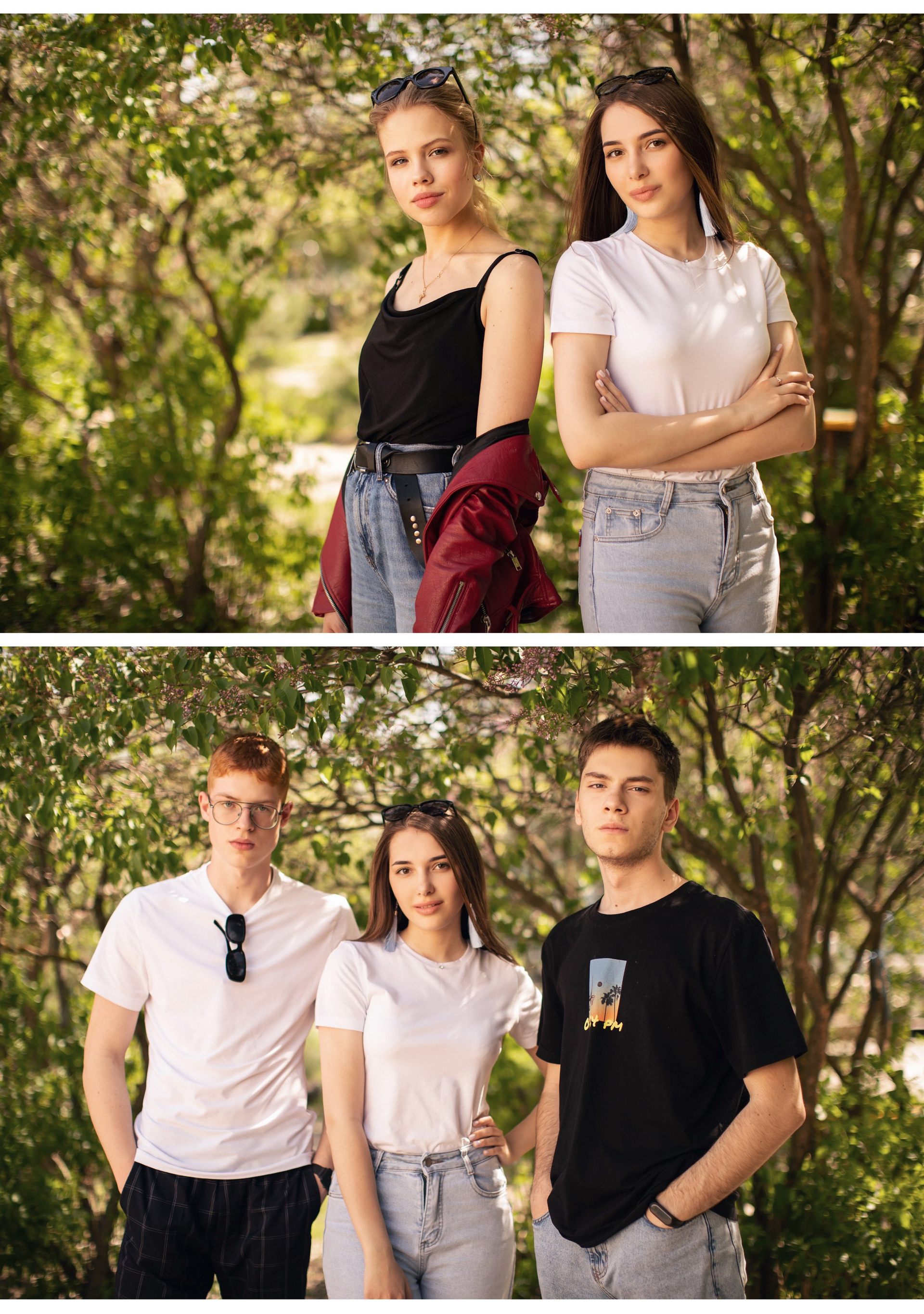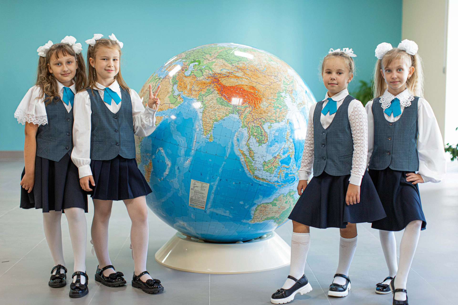В школьной форме в школе / библиотеке / В свободной форме в парке / на стадионе